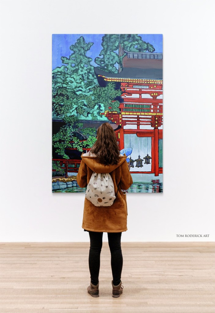 Artist interpretation of Kasuga Shrine, Nara, from the series “Collection of Scenic Views of Japan II, Kansai Edition” woodblock print.