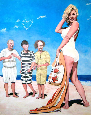 Cupid’s Arrow is a vibrant painting of Marilyn Monroe posing in a swimsuit on the beach as the three stooges look on and drool by portrait artist Tom Roderick of Boulder, Colorado.